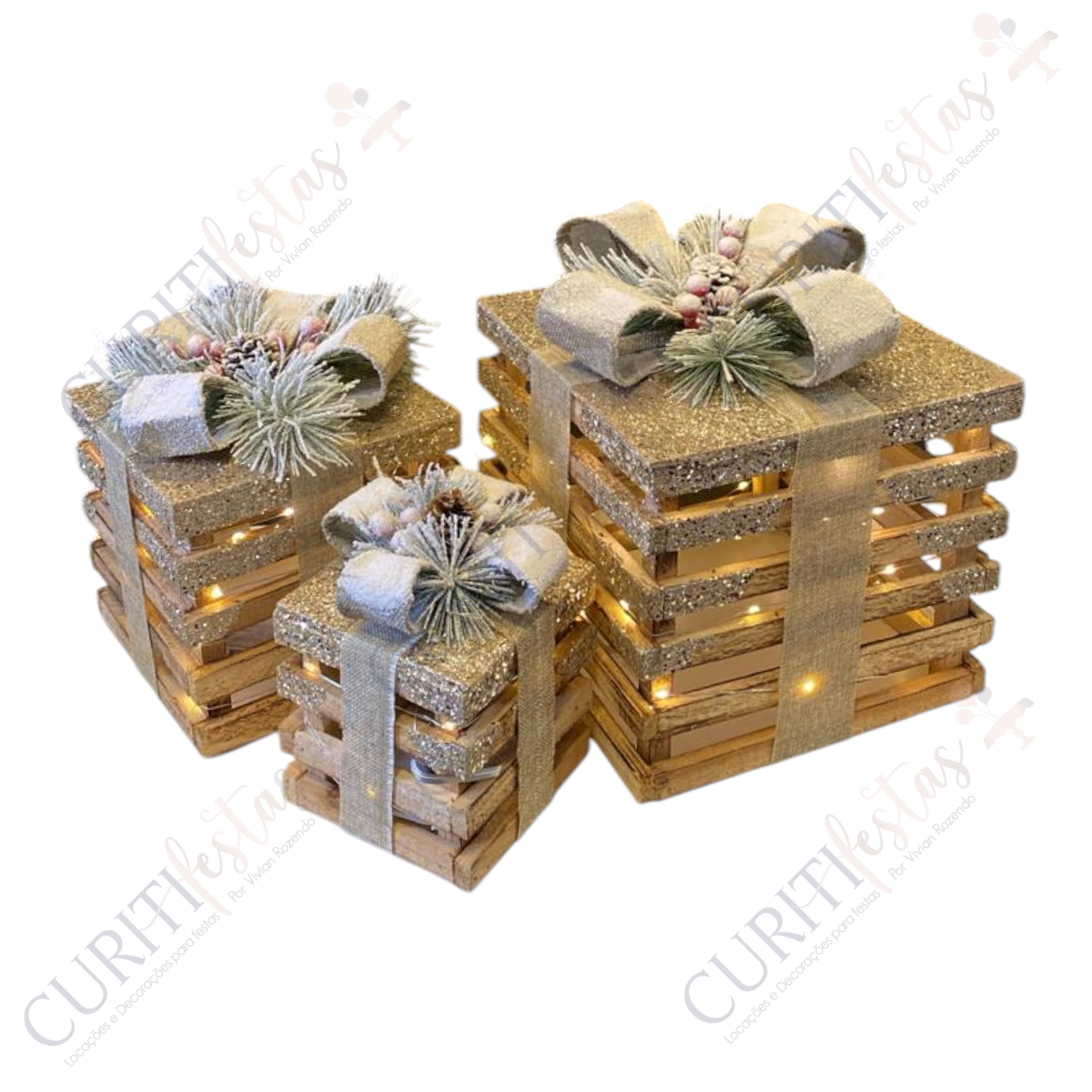 Caixa - Natal - Iluminada - Madeira - Laço - Trio quantidade
