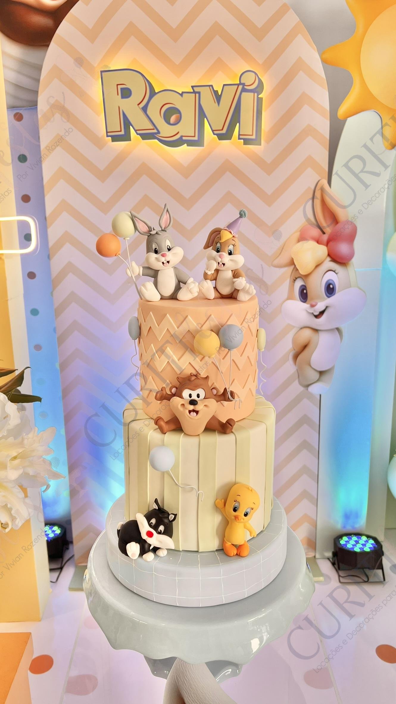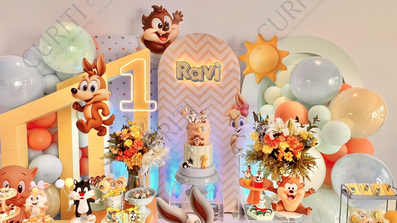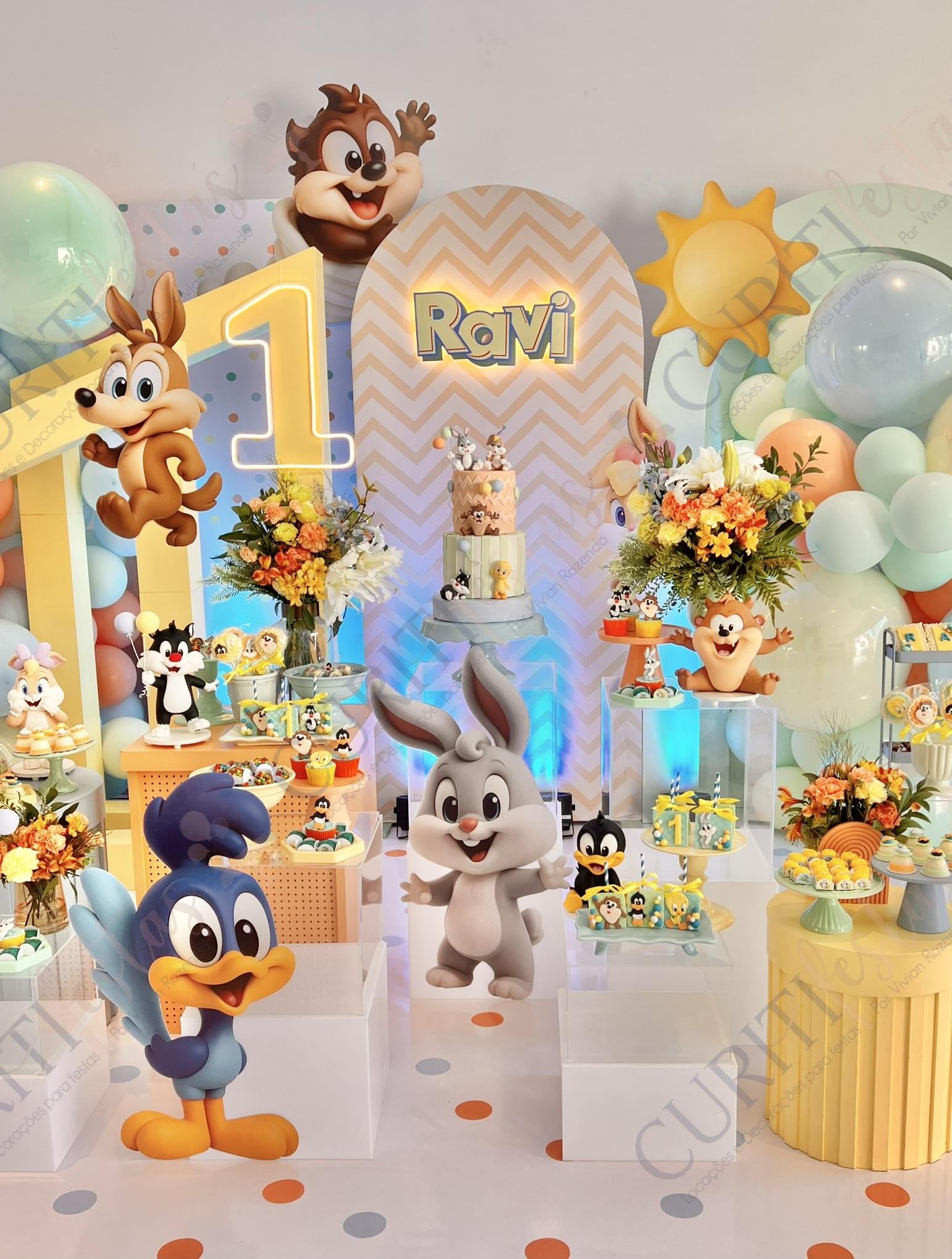 Inspirada nos adoráveis personagens em versão bebê — Pernalonga, Piu-Piu, Patolino, Frajola, Lola e tantos outros — a festa conquista logo de início. Desde a entrada até os pequenos detalhes, tudo remete ao universo encantador dos Baby Looney Tunes: personagens de biscuit e totens dos personagens, arranjos delicados e elementos lúdicos que criam uma atmosfera alegre e acolhedora.