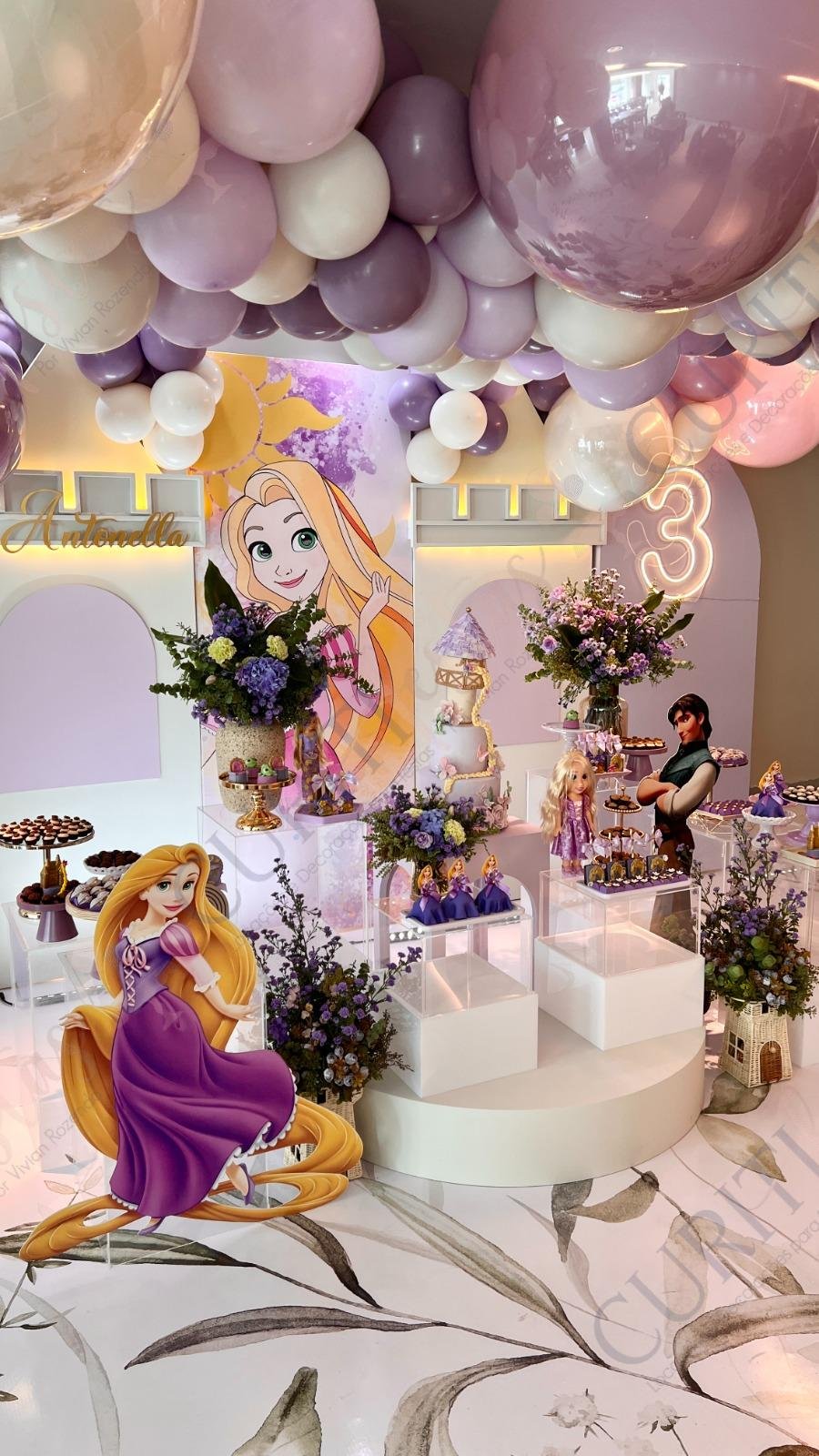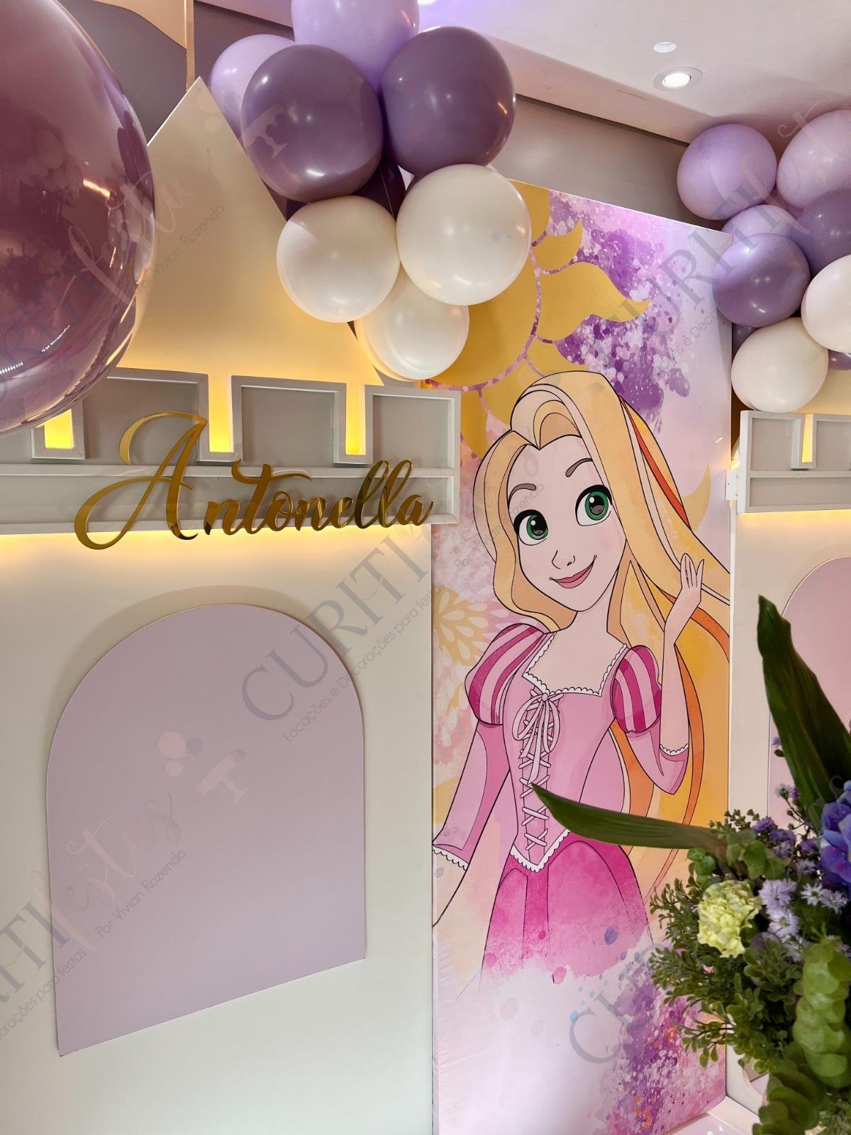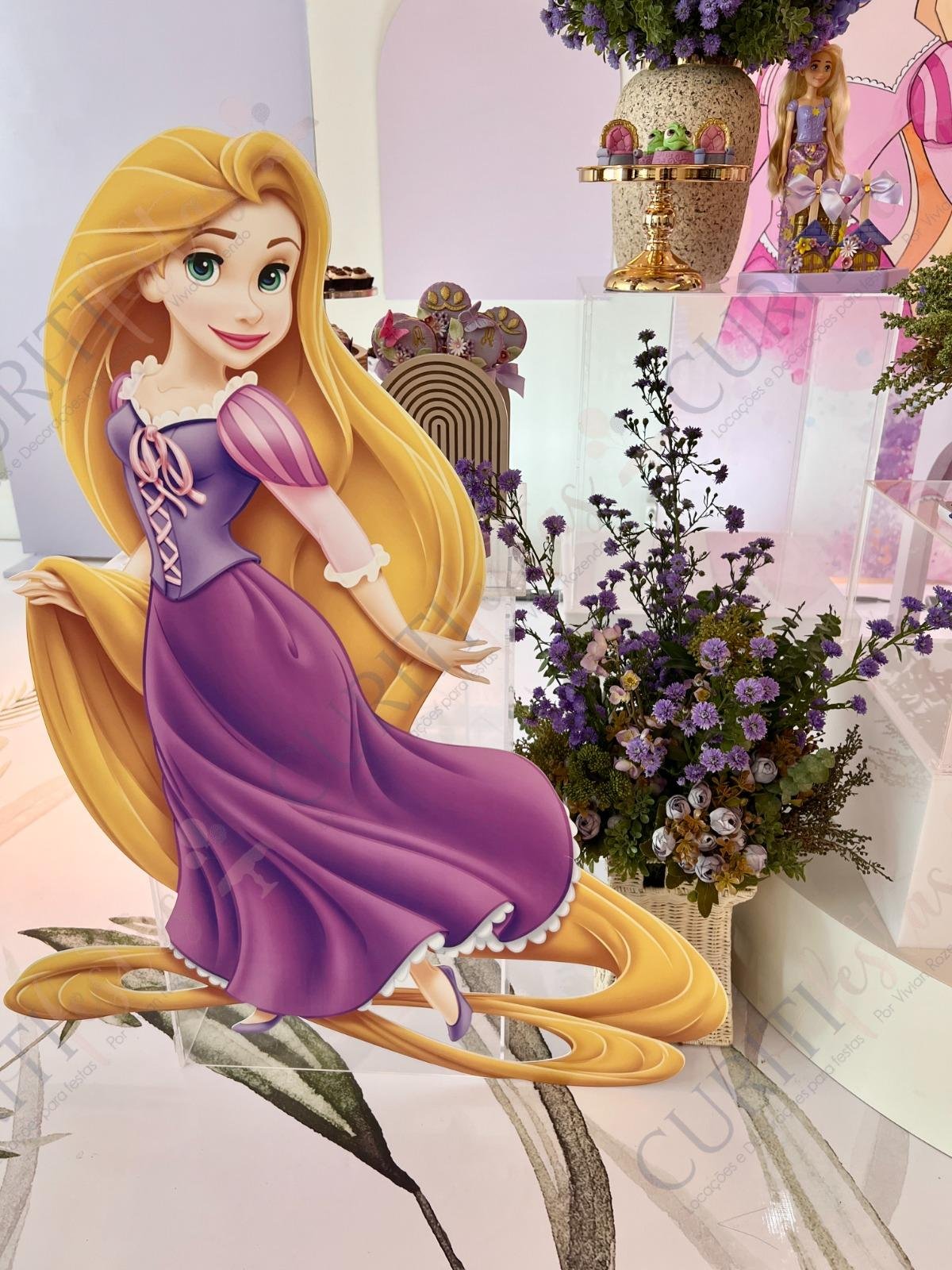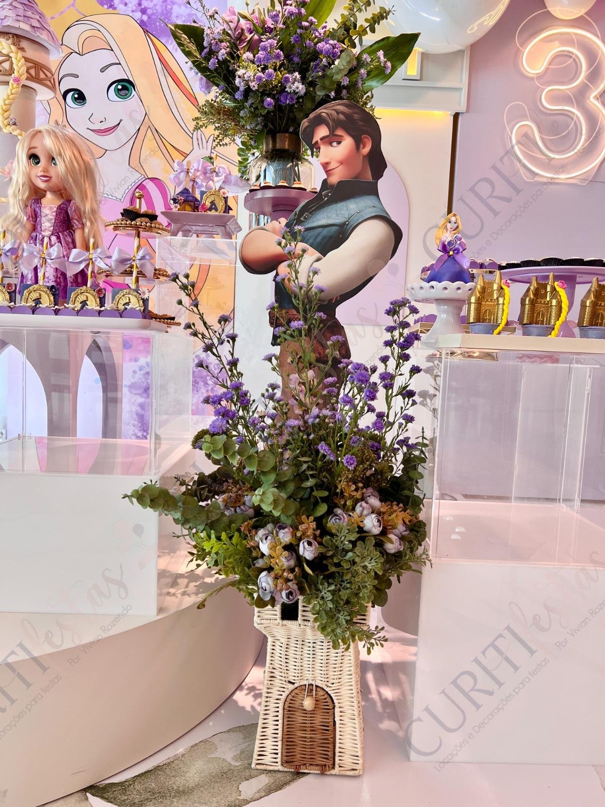 Decoração de festas com o Tema Princesa Rapunzel. Transforme a sua festa em um conto de fadas encantado com esta temática! Nossa coleção exclusiva de decorações traz todo o encanto da história da Princesa Rapunzel com seus longos cabelos dourados diretamente para o seu evento. Cada detalhe foi cuidadosamente elaborado para criar uma atmosfera mágica. Os tons suaves de roxo e dourado predominam em nossa seleção, adicionando um toque de realeza e sofisticação à sua festa. Surpreenda seus convidados com a imersão na decoração do tema Rapunzel, enquanto a beleza dos elementos decorativos transforma o ambiente.