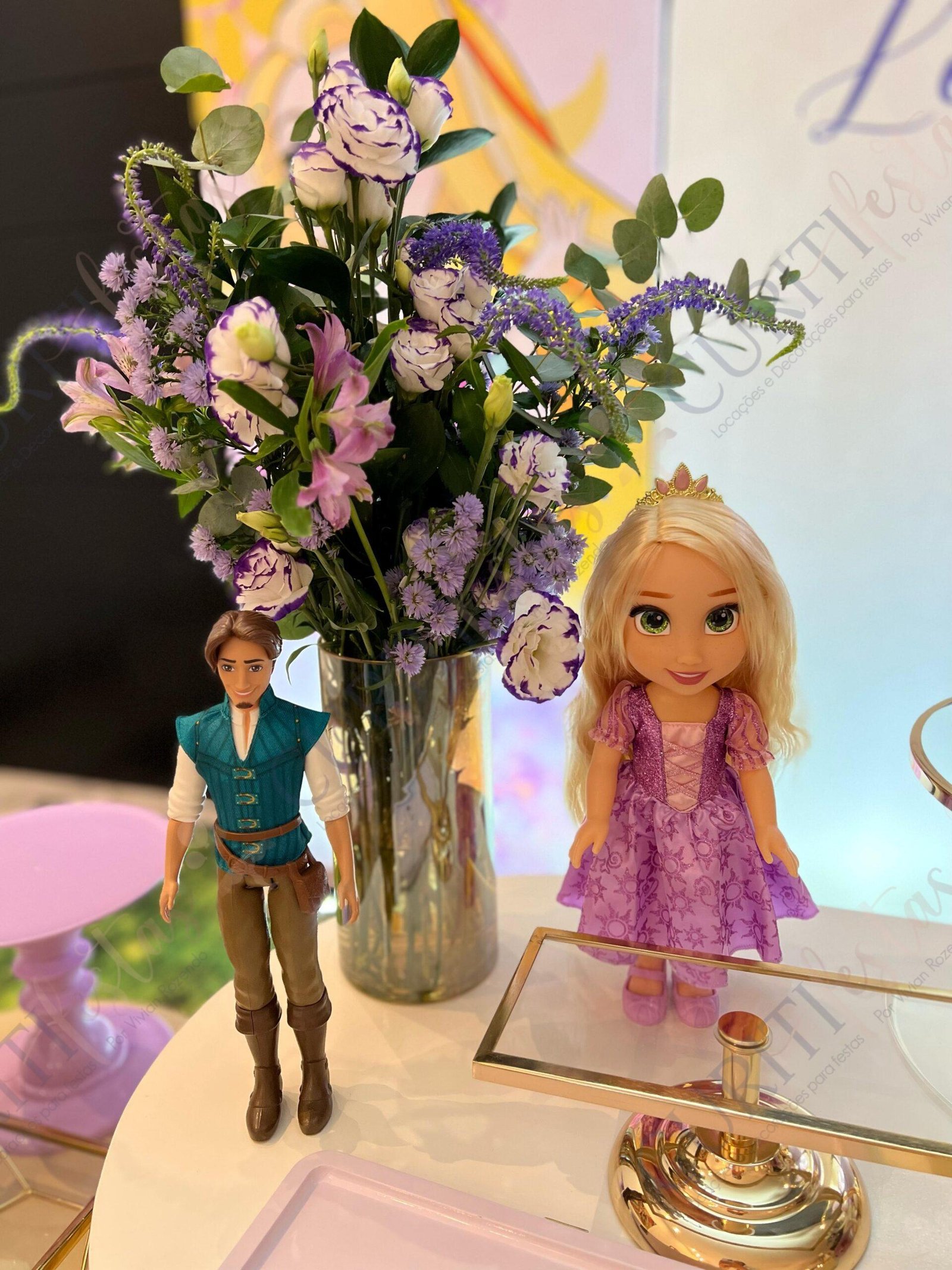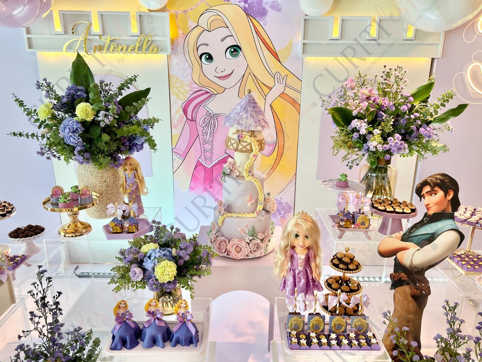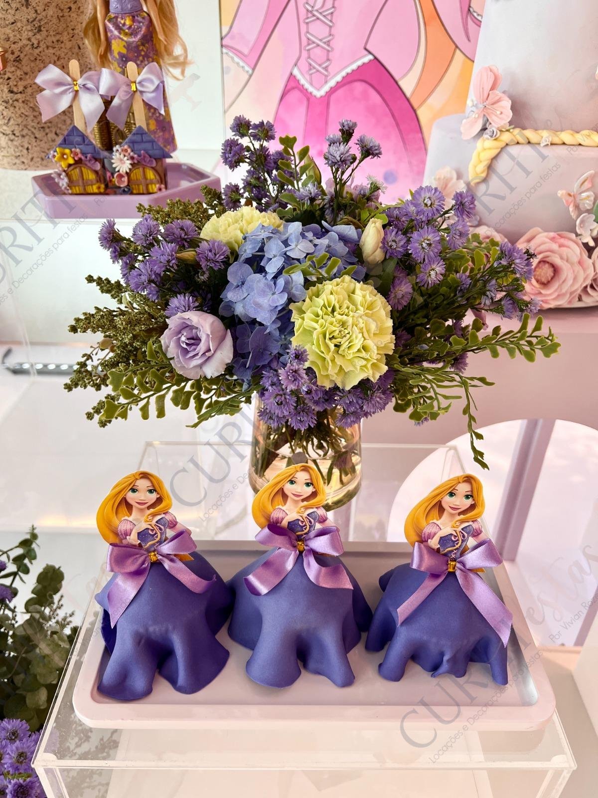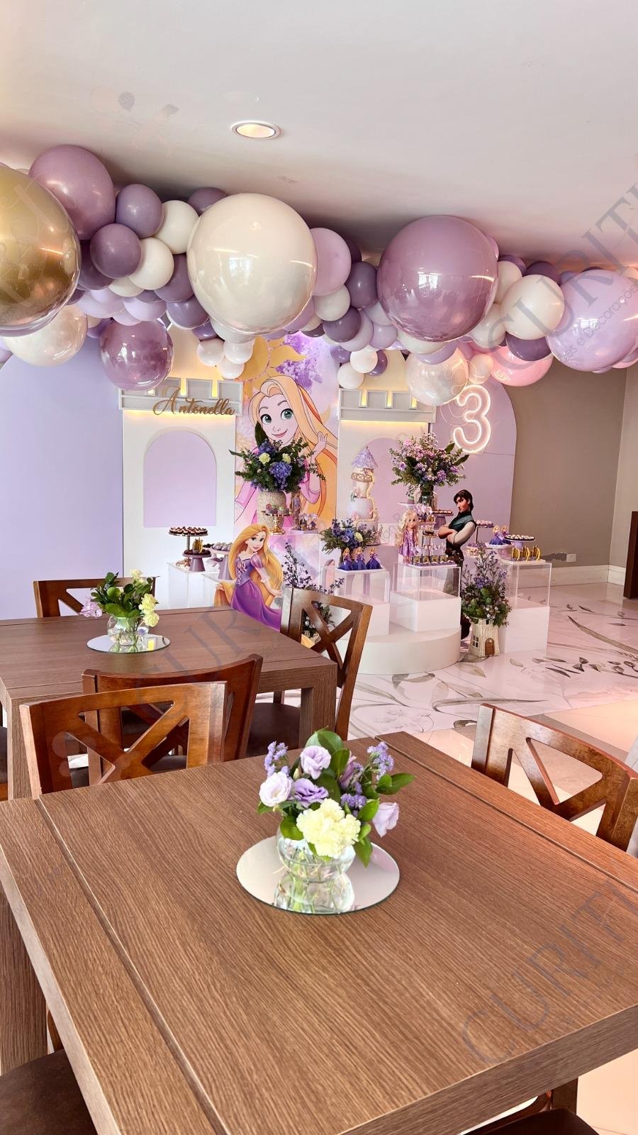 Decoração de festas com o Tema Princesa Rapunzel. Transforme a sua festa em um conto de fadas encantado com esta temática! Nossa coleção exclusiva de decorações traz todo o encanto da história da Princesa Rapunzel com seus longos cabelos dourados diretamente para o seu evento. Cada detalhe foi cuidadosamente elaborado para criar uma atmosfera mágica. Os tons suaves de roxo e dourado predominam em nossa seleção, adicionando um toque de realeza e sofisticação à sua festa. Surpreenda seus convidados com a imersão na decoração do tema Rapunzel, enquanto a beleza dos elementos decorativos transforma o ambiente.
