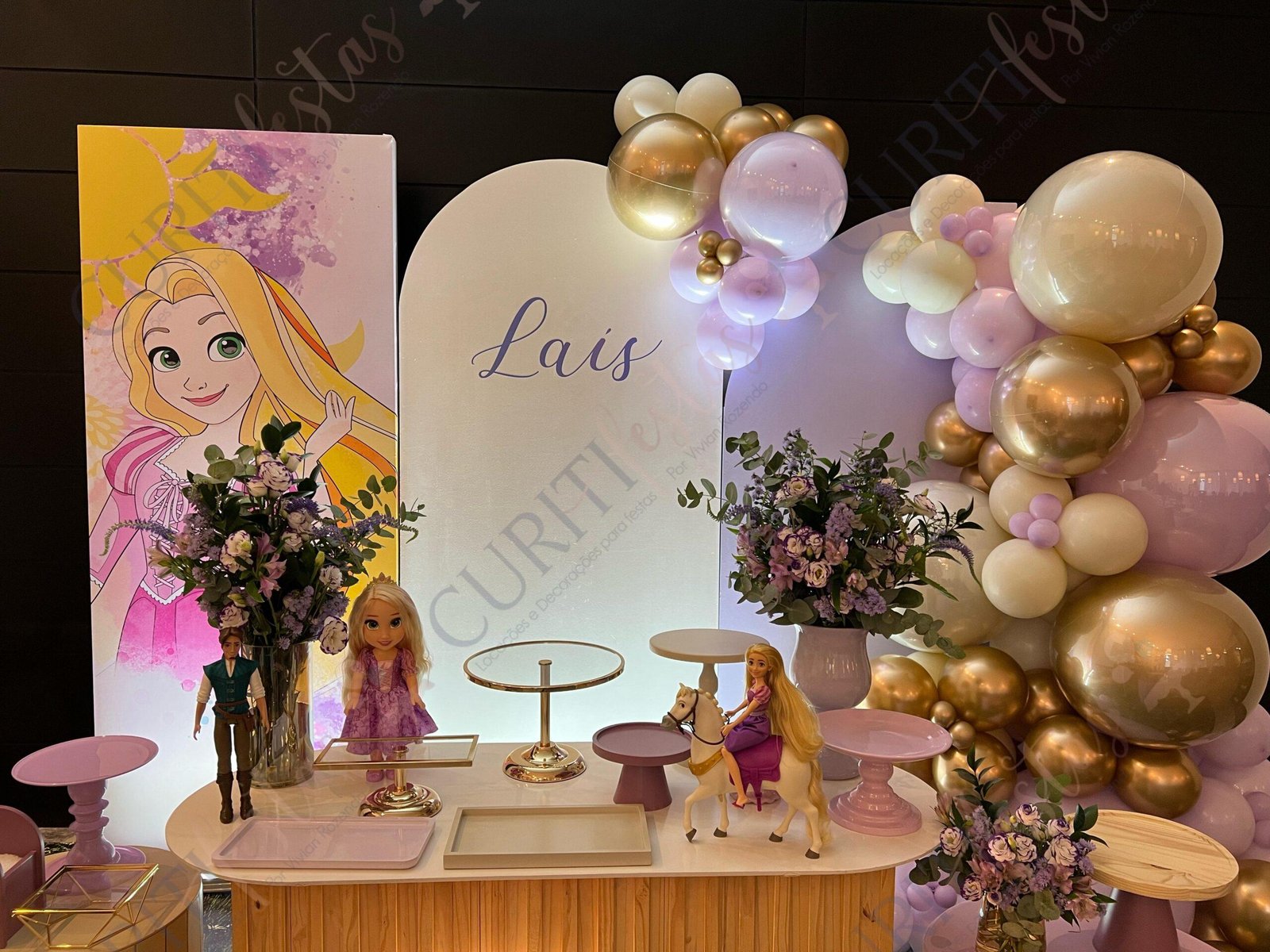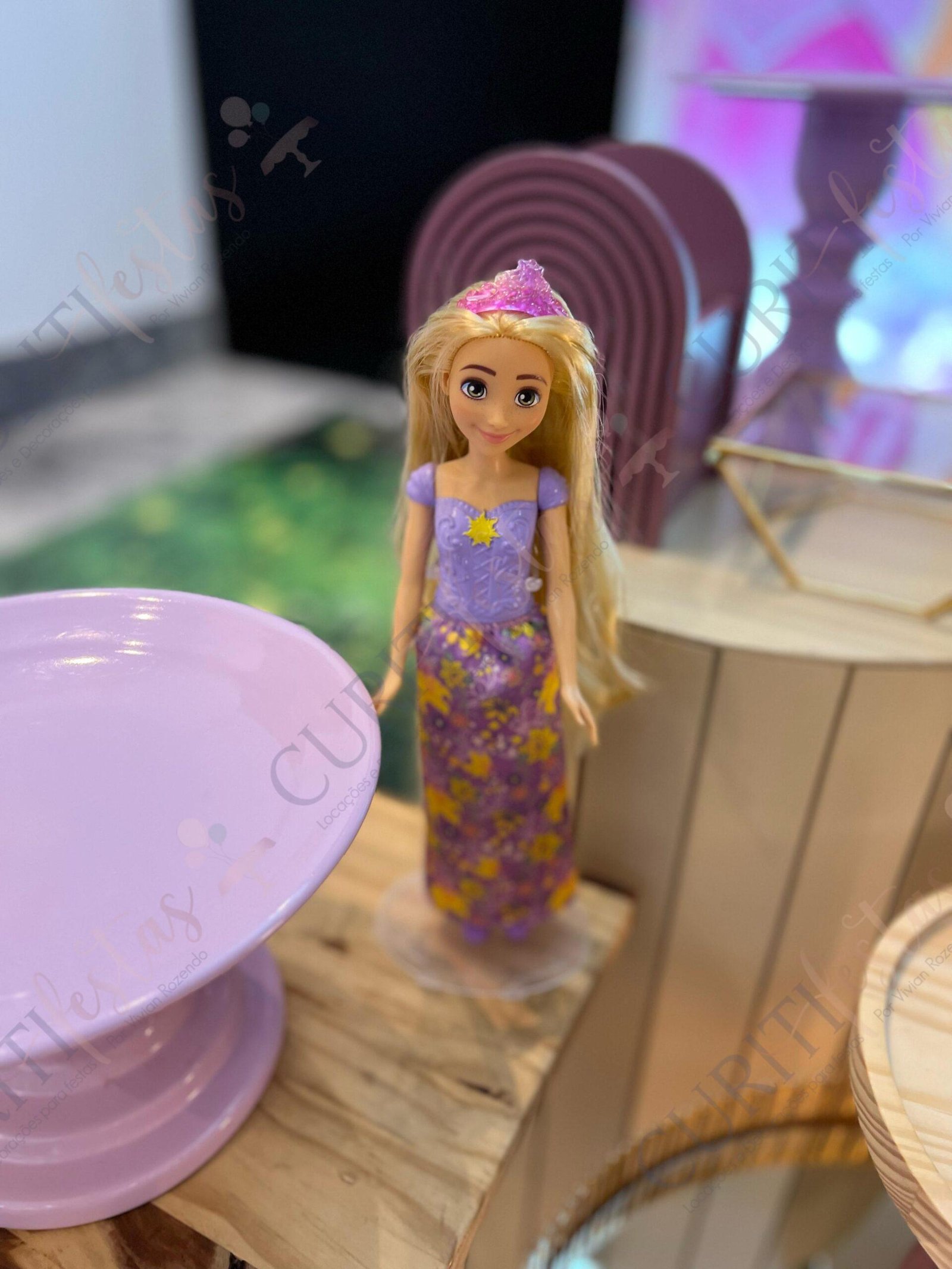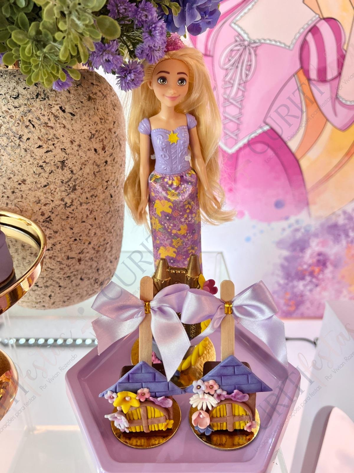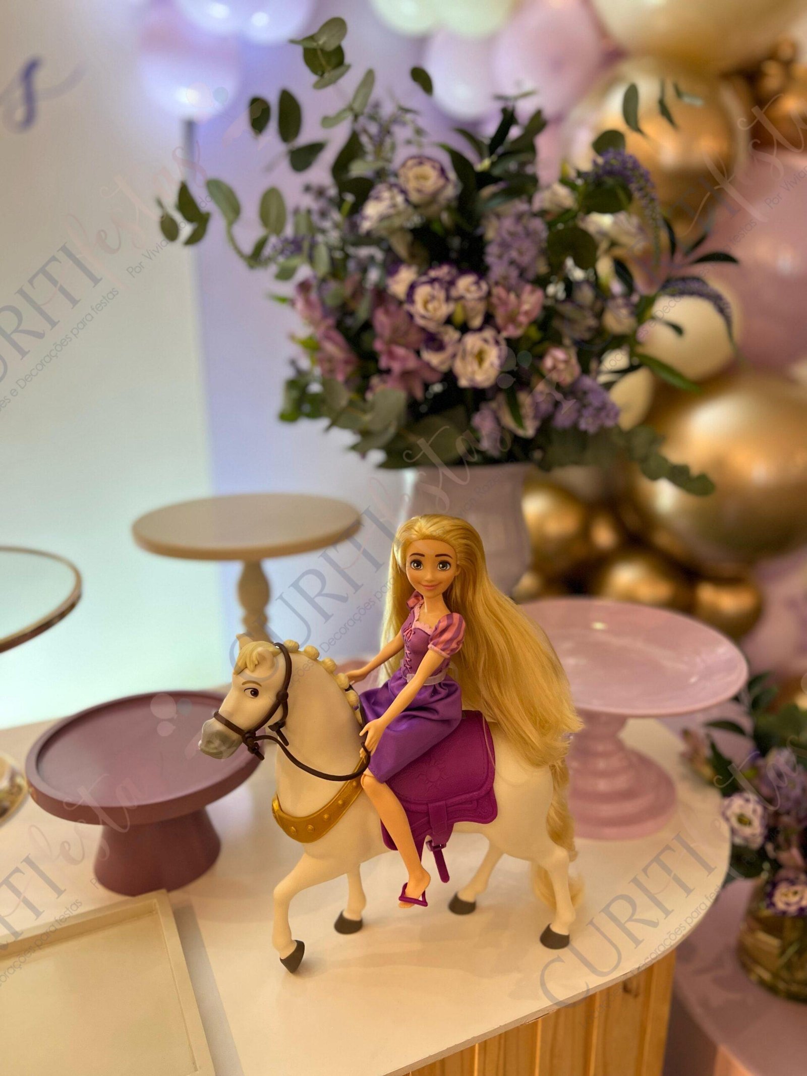 Decoração de festas com o Tema Princesa Rapunzel. Transforme a sua festa em um conto de fadas encantado com esta temática! Nossa coleção exclusiva de decorações traz todo o encanto da história da Princesa Rapunzel com seus longos cabelos dourados diretamente para o seu evento. Cada detalhe foi cuidadosamente elaborado para criar uma atmosfera mágica. Os tons suaves de roxo e dourado predominam em nossa seleção, adicionando um toque de realeza e sofisticação à sua festa. Surpreenda seus convidados com a imersão na decoração do tema Rapunzel, enquanto a beleza dos elementos decorativos transforma o ambiente.