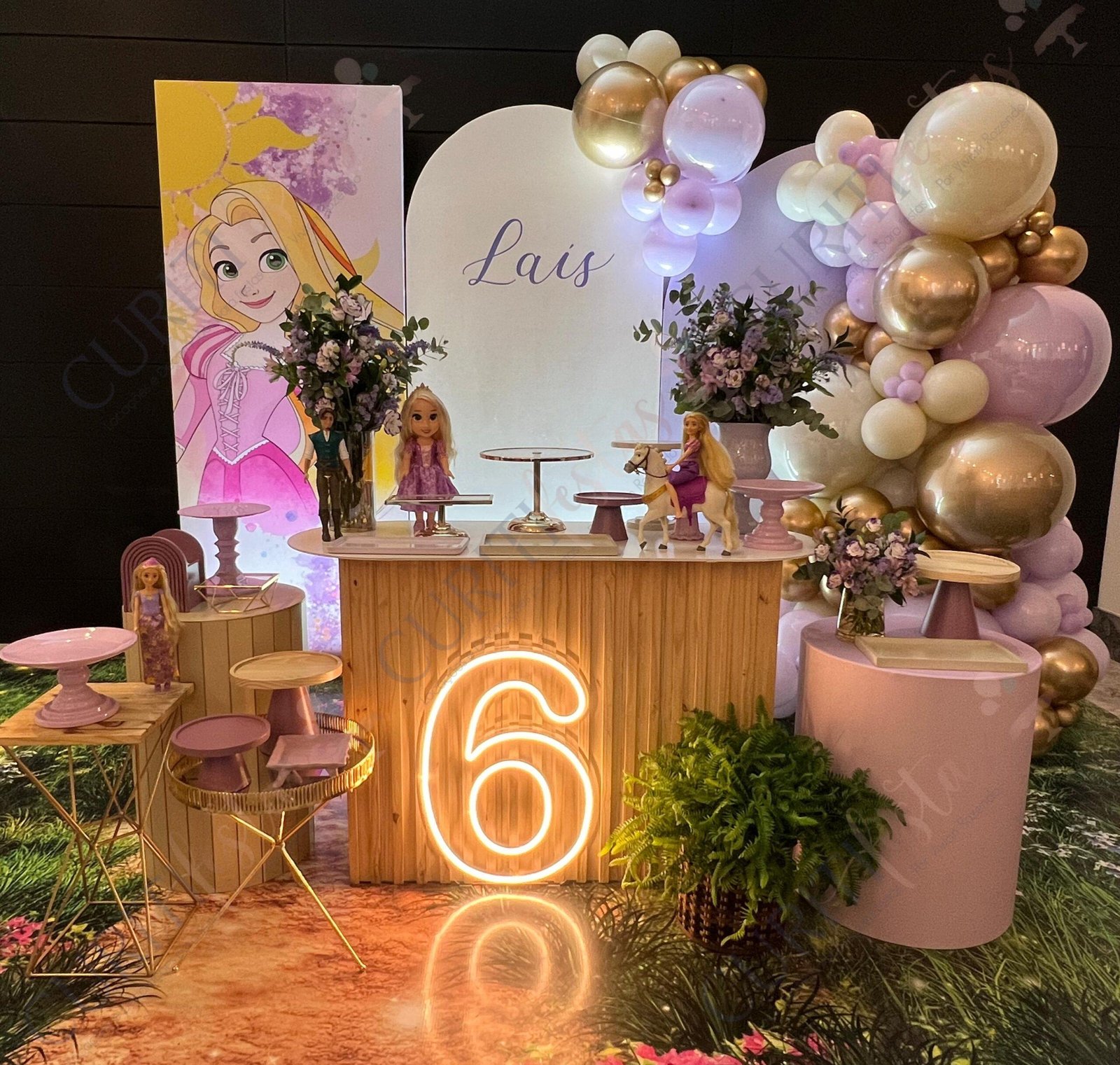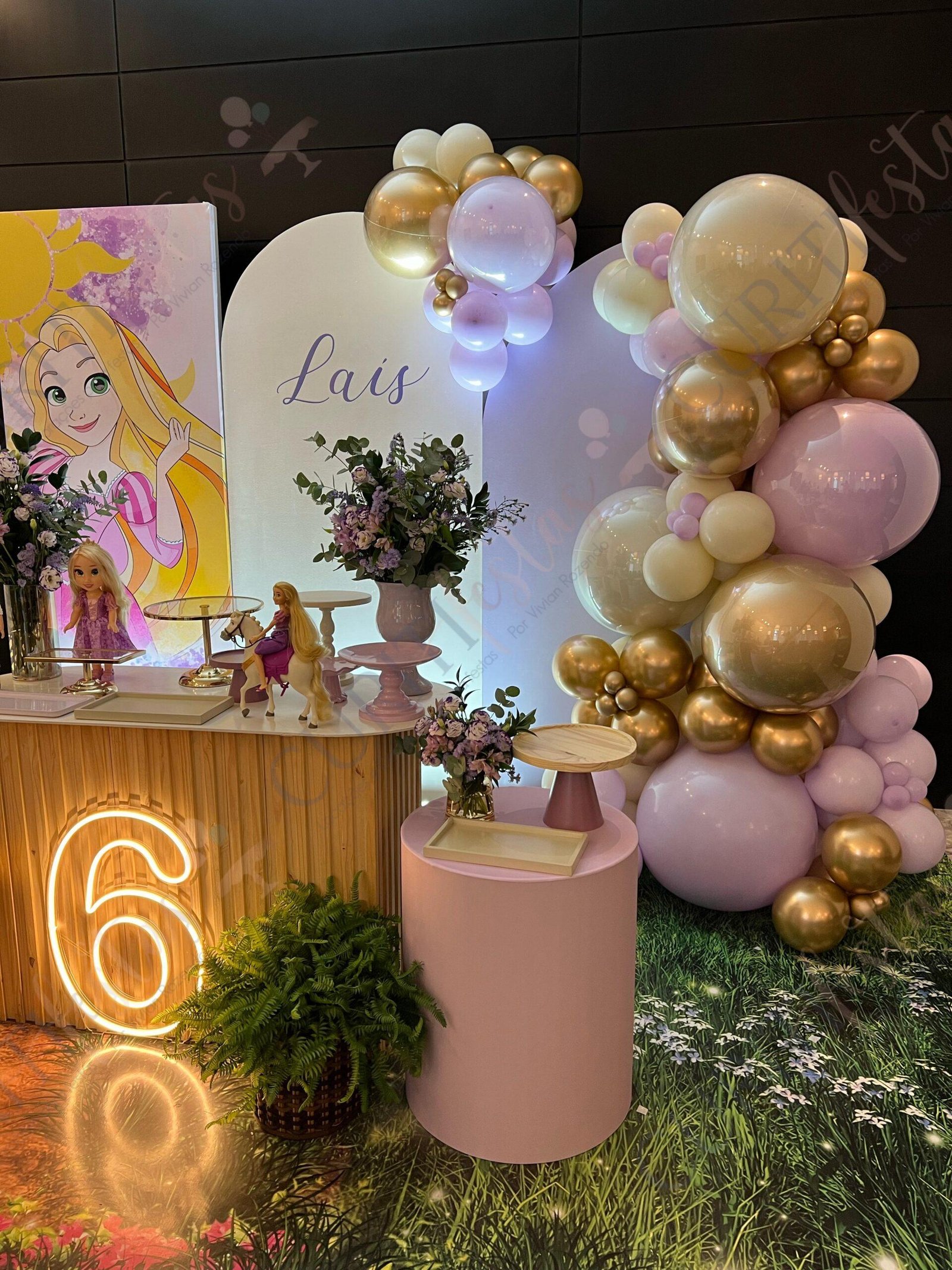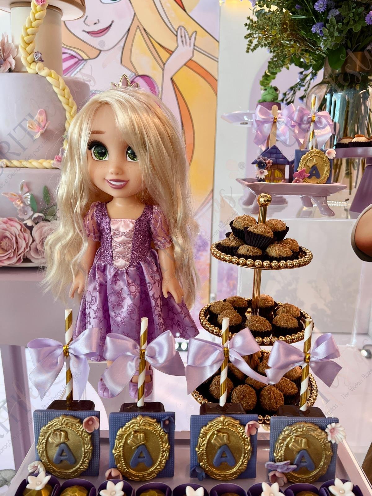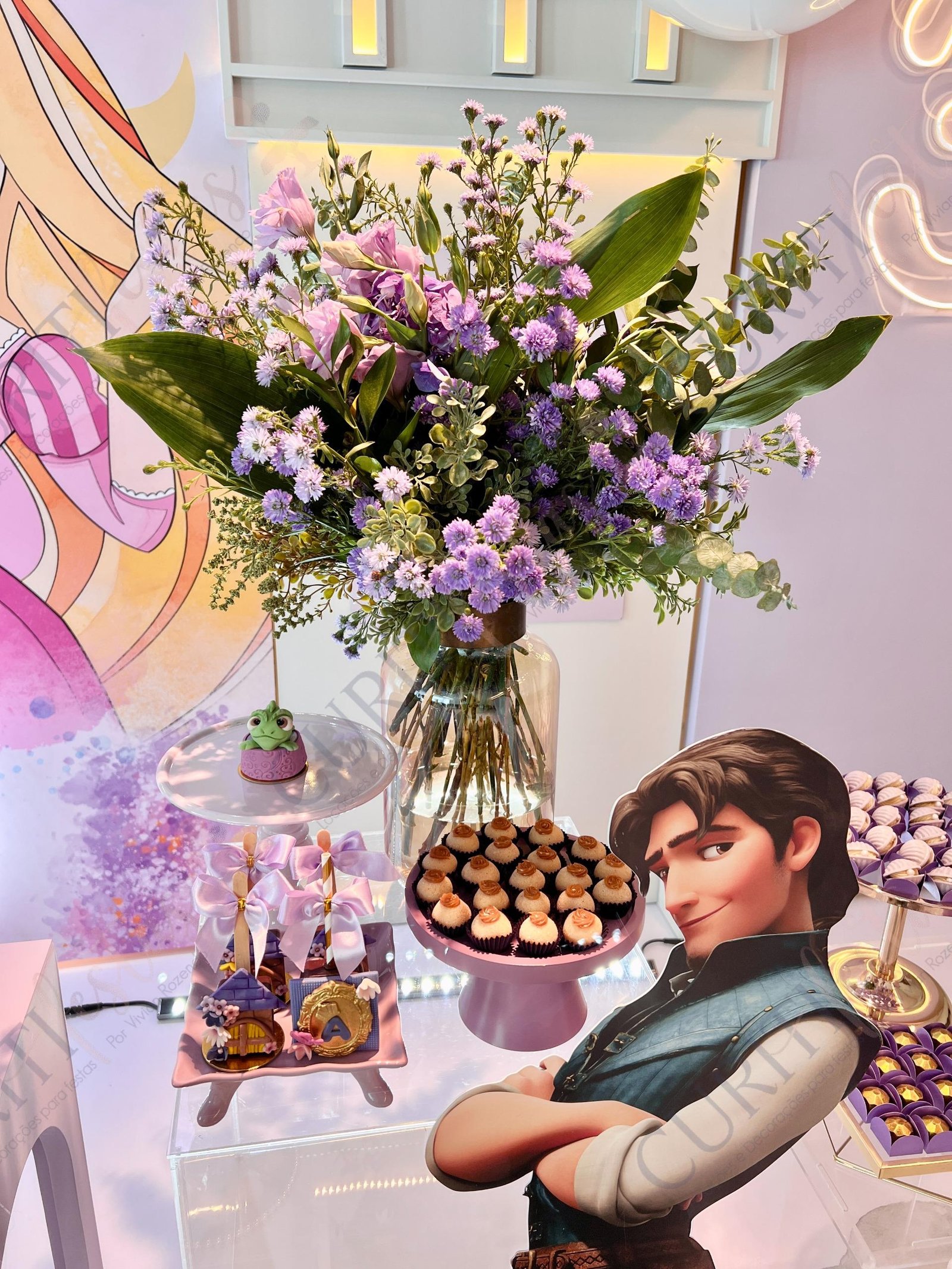 Decoração de festas com o Tema Princesa Rapunzel. Transforme a sua festa em um conto de fadas encantado com esta temática! Nossa coleção exclusiva de decorações traz todo o encanto da história da Princesa Rapunzel com seus longos cabelos dourados diretamente para o seu evento. Cada detalhe foi cuidadosamente elaborado para criar uma atmosfera mágica. Os tons suaves de roxo e dourado predominam em nossa seleção, adicionando um toque de realeza e sofisticação à sua festa. Surpreenda seus convidados com a imersão na decoração do tema Rapunzel, enquanto a beleza dos elementos decorativos transforma o ambiente.
